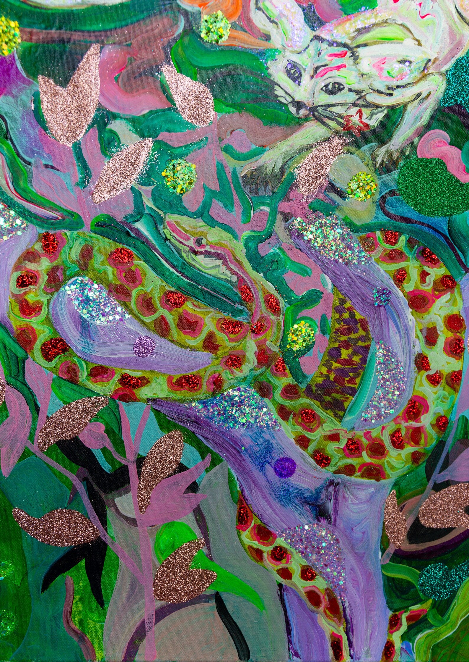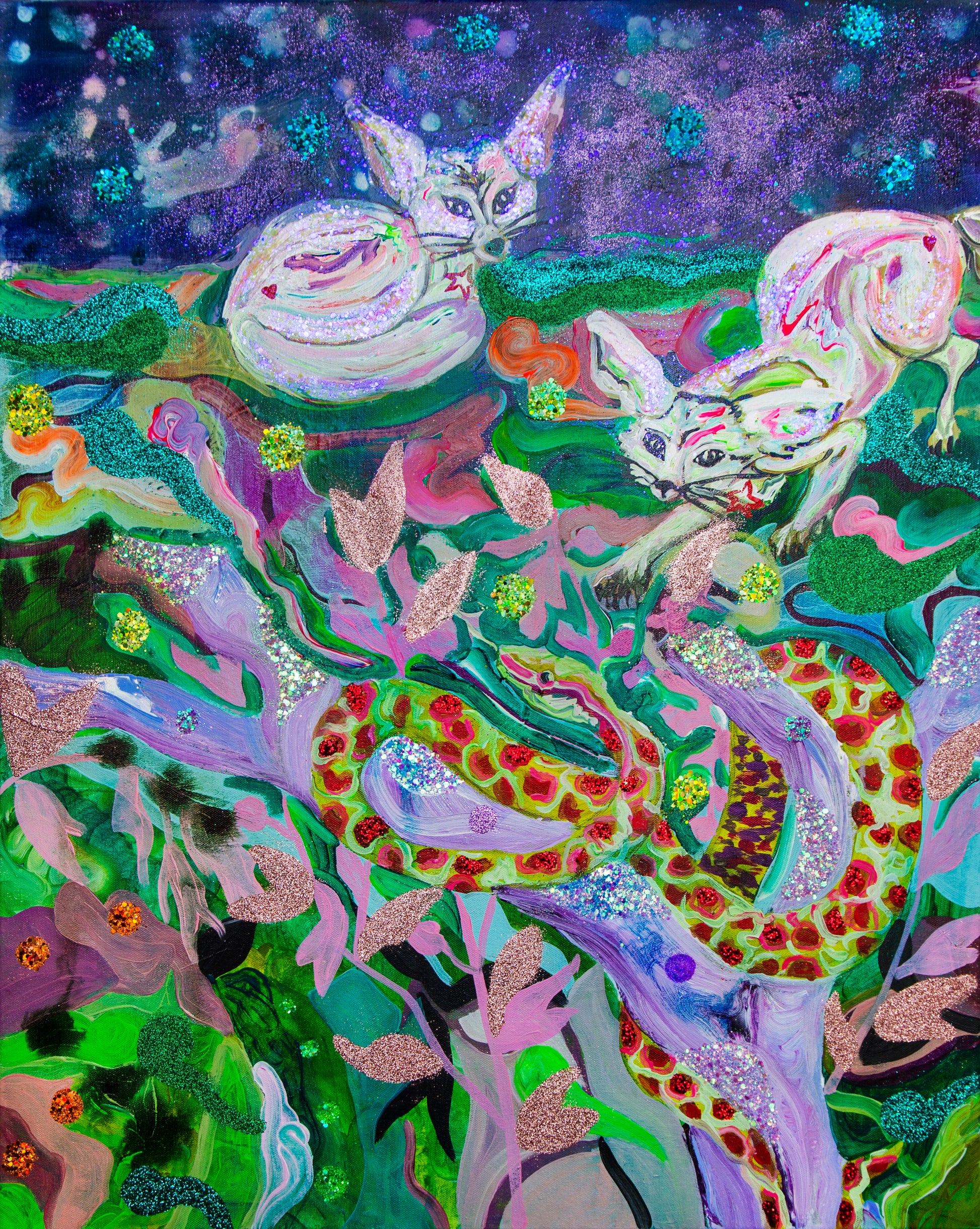 Medium: acrylic, gold leaves, fine glitter, inks