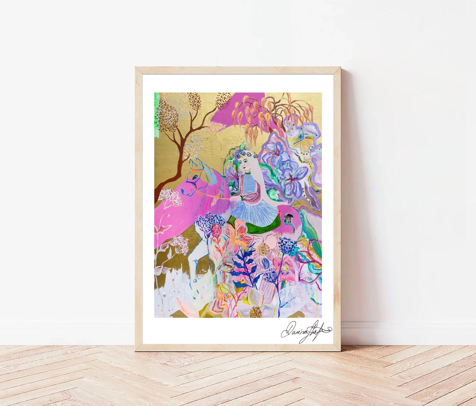 In these paintings, figures and animals inhabit landscapes that are both allegorical and ornamental: women riding fantastical horses, lovers surrounded by blossoms, bodies woven into the same fabric as the flowers and patterns around them. The gold ground transforms them into icons, while the vivid colors and fluid brushwork make them pulse with modern emotion. Between tradition and reinvention, this series is an ode to beauty, intimacy, and the timeless search for harmony between humanity and nature.