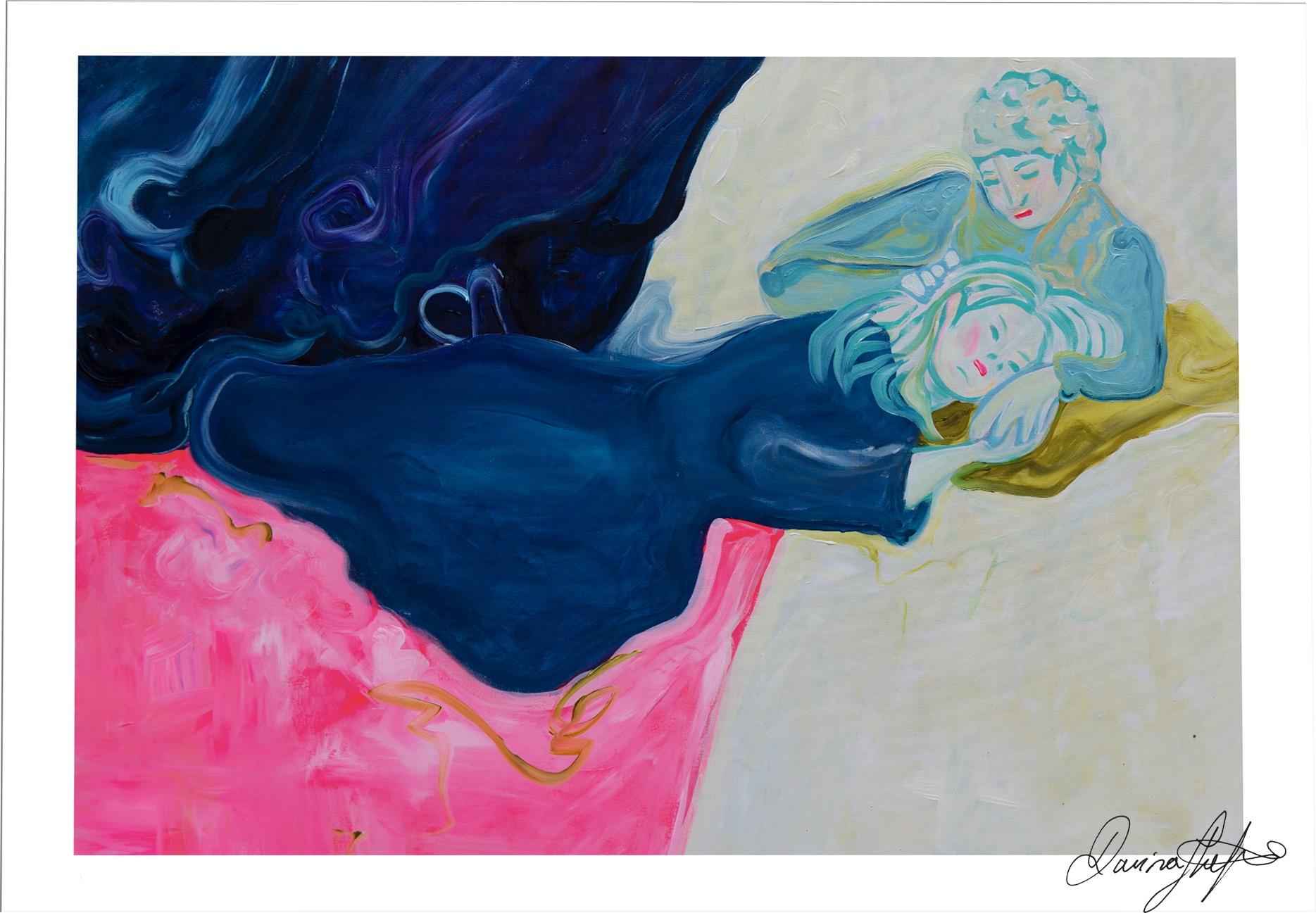 Self-Pity Party traces the five stages of a love story, from its bright beginnings to its inevitable dissolution. This final painting closes the cycle. The couple lies together, yet already apart: she leans into a partner rendered as a ghostlike presence, a fading silhouette.