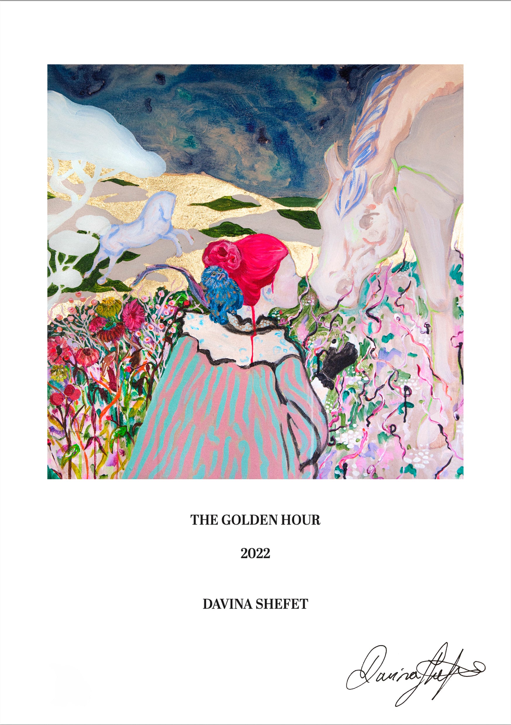 The Golden Hour is part of Davina Shefet’s Golden Hour series, a body of work that explores the luminous, fleeting moments between day and night. This piece portrays a nomadic young woman — a figure with echoes of Pippi Longstocking, part adventurer and part dreamer — accompanied by her timid blue monkey perched on her shoulder. Together they encounter a mystical white horse in a flowering landscape, a meeting that captures both wonder and vulnerability as twilight sets in.